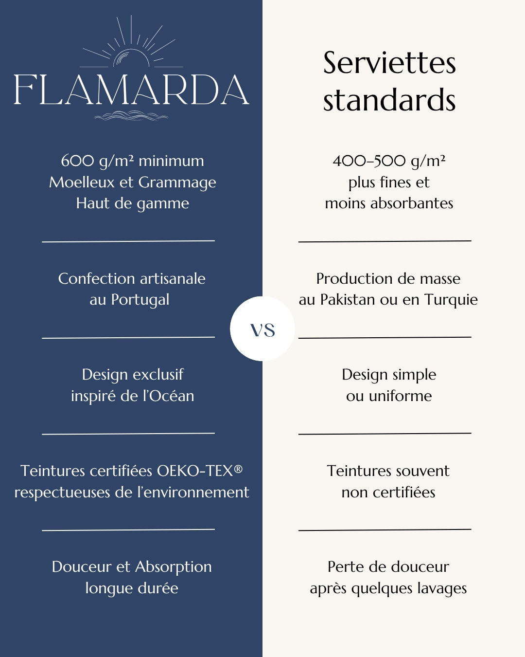 Chez FLAMARDA, nous nous engageons à offrir un Linge de bain haut de gamme, alliant élégance et qualité :