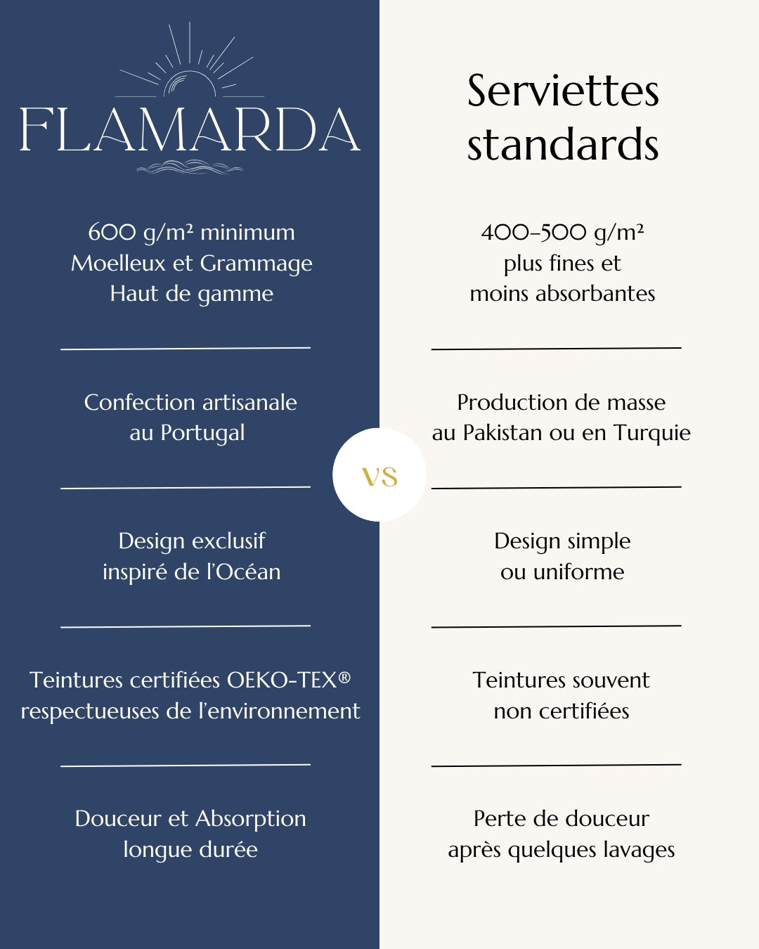 Chez FLAMARDA, nous mettons un point d’honneur à vous offrir un linge de bain haut de gamme en respectant des standards d’excellence :